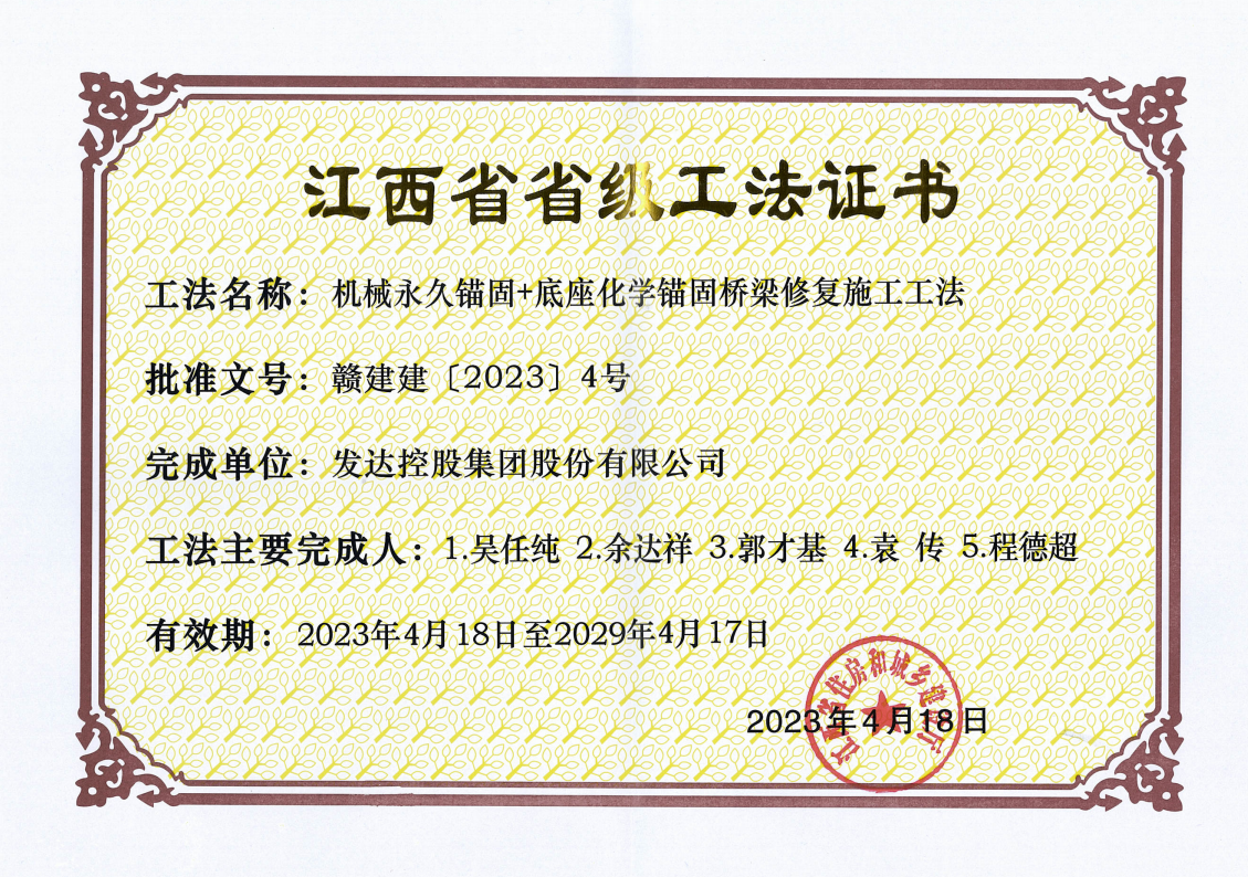 近日,江西省住房和城乡建设厅公布了2022年度第二批省级工程建设工法名单。发达控股集团两项工法《机械永久锚固+底座化学锚固桥梁修复施工工法》、《定型轻质模块组合实心空心楼盖施工工法》成功获评江西省省级工法。